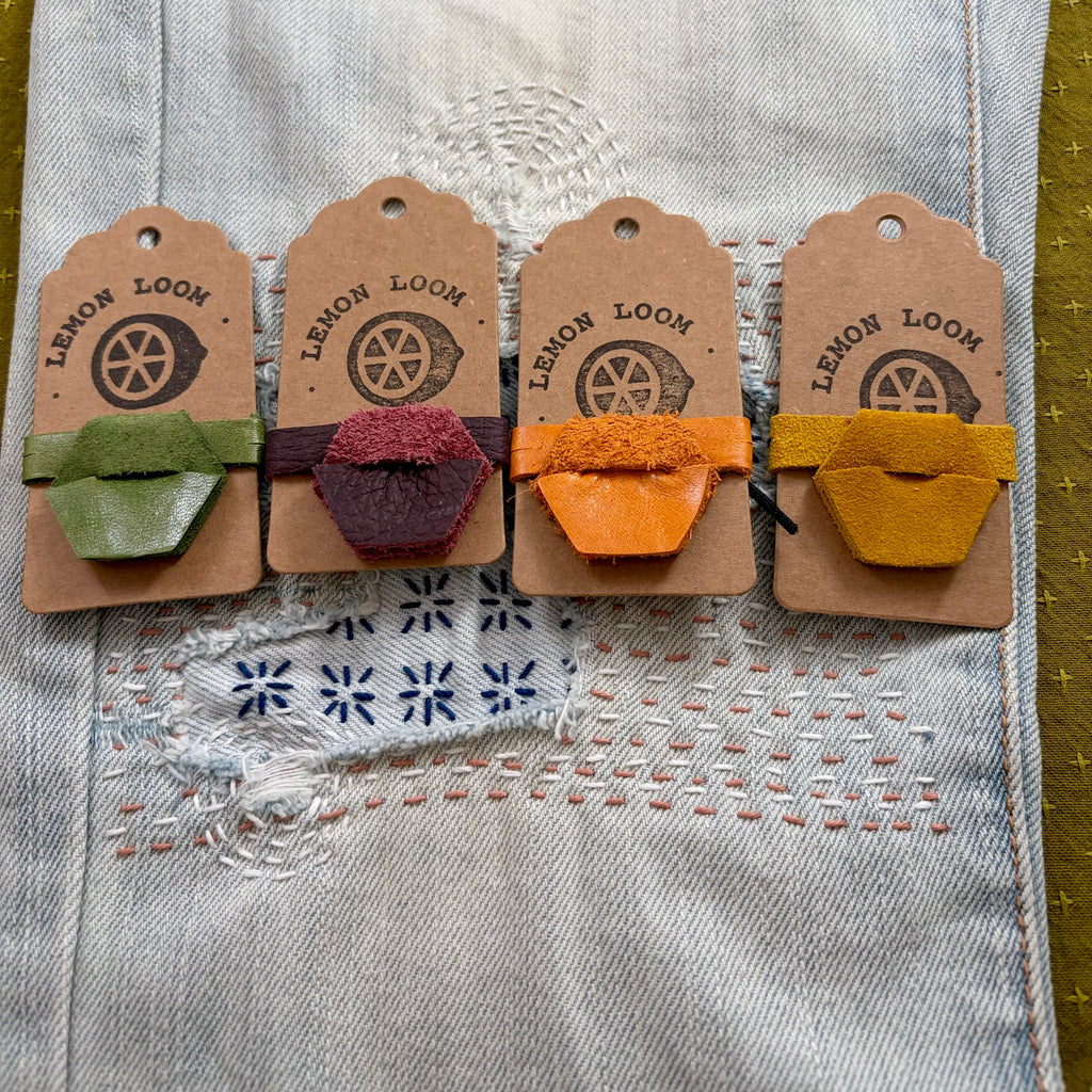 -handmade, locally made leather palm thimble in green, red, orange, or yellow